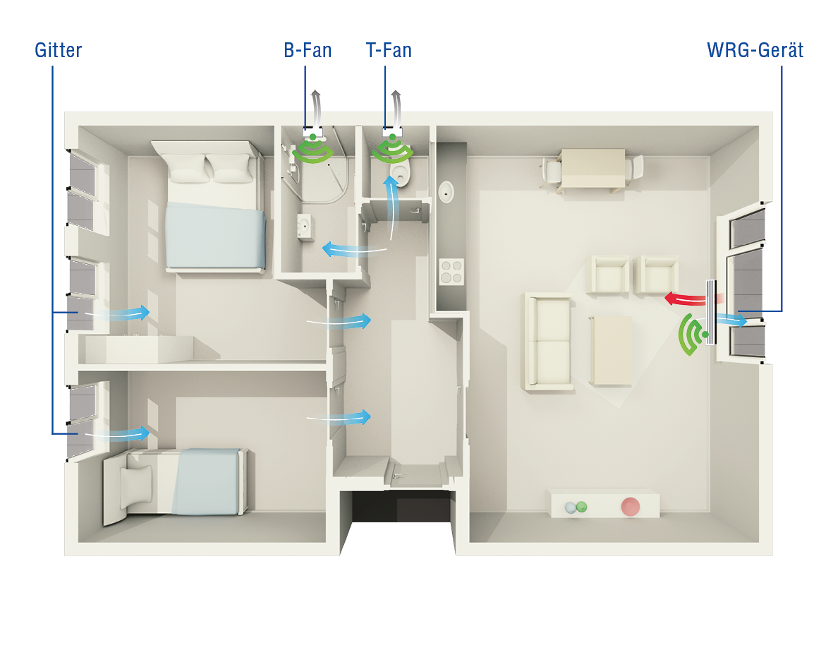 Eine dezentrale* Wärmerückgewinnungseinheit (WRG) liefert saubere Luft und führt verschmutzte Luft ab. Dies geschieht nur in den warmen Räumen wie dem Wohnzimmer.