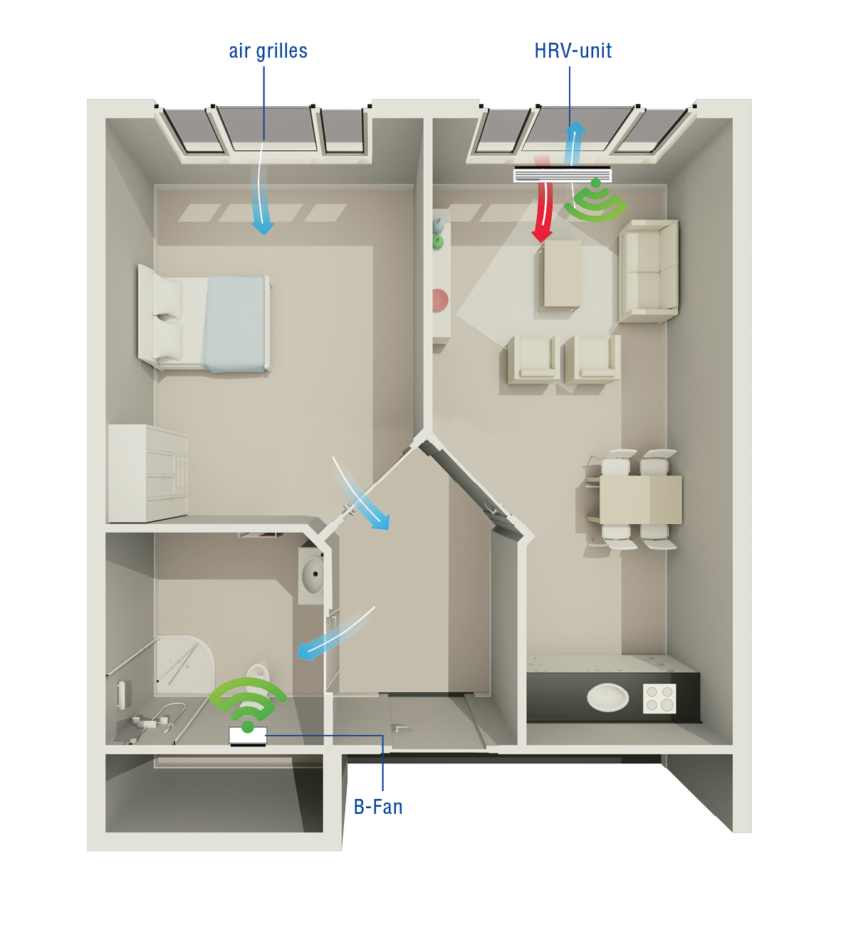 With this ClimaRad Supply Solution, the living room in (care)houses is ventilated by a decentralised ventilation unit that provides clean (preheated by heat recovery) air and removes polluted air. The bedrooms are ventilated by ClimaRad S-Fans. These Fans provide the bedrooms with a comfortable air supply so that -in collaboration with the ventilation unit and extraction- a healty indoor air climate is created in all rooms.