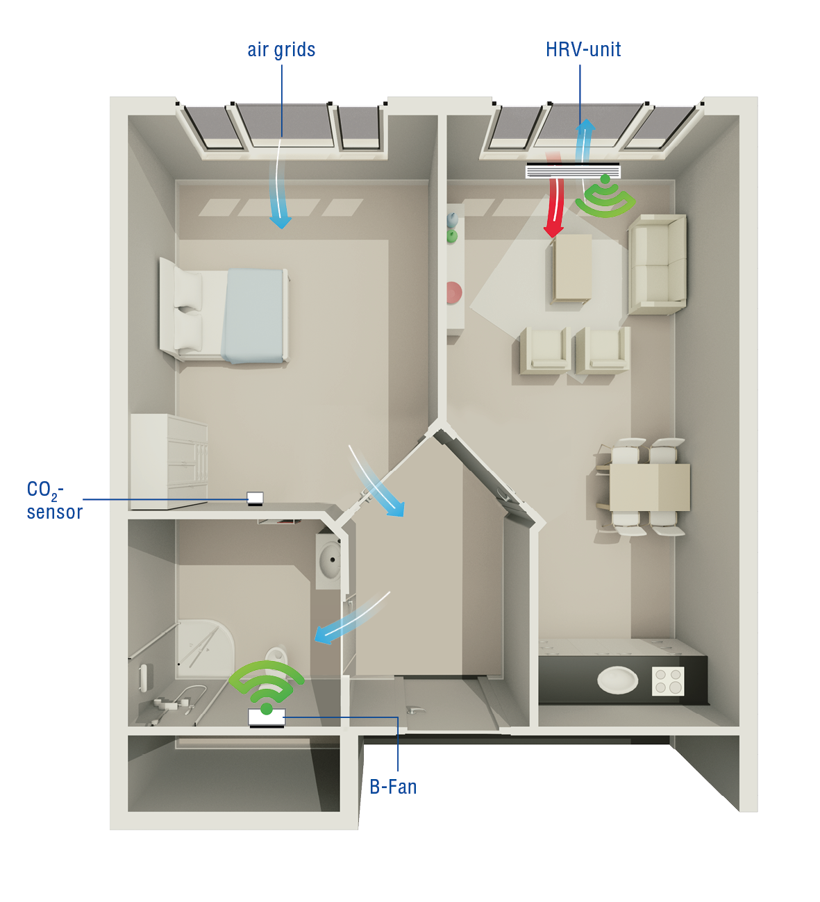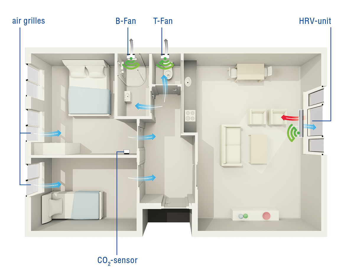 * A decentralised ventilation system controls the indoor climate per room. Read more about decentralised ventilation on our website.