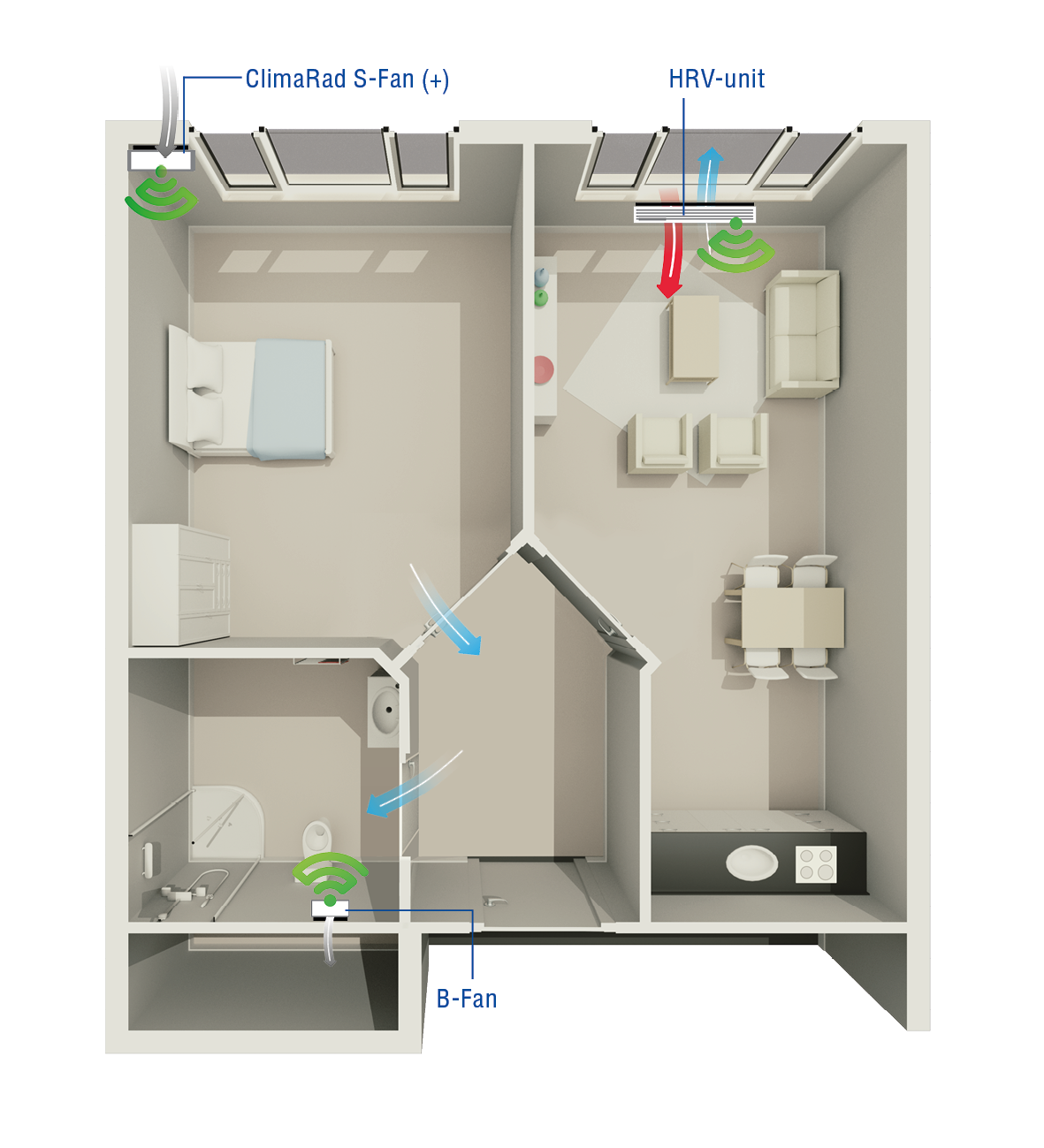 The ClimaRad Smart Supply Solution provides a healthy and comfortable indoor climate, where HRV is combined with S-Fans in the bedroom(s).