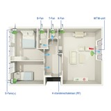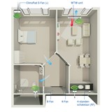 De decentrale* WTW-unit zorgt voor de ventilatie en evt. verwarming/ koeling in het warme vertrek, in de koude vertrekken regelen S-Fans de mechanische toevoer van voorverwarmde lucht.